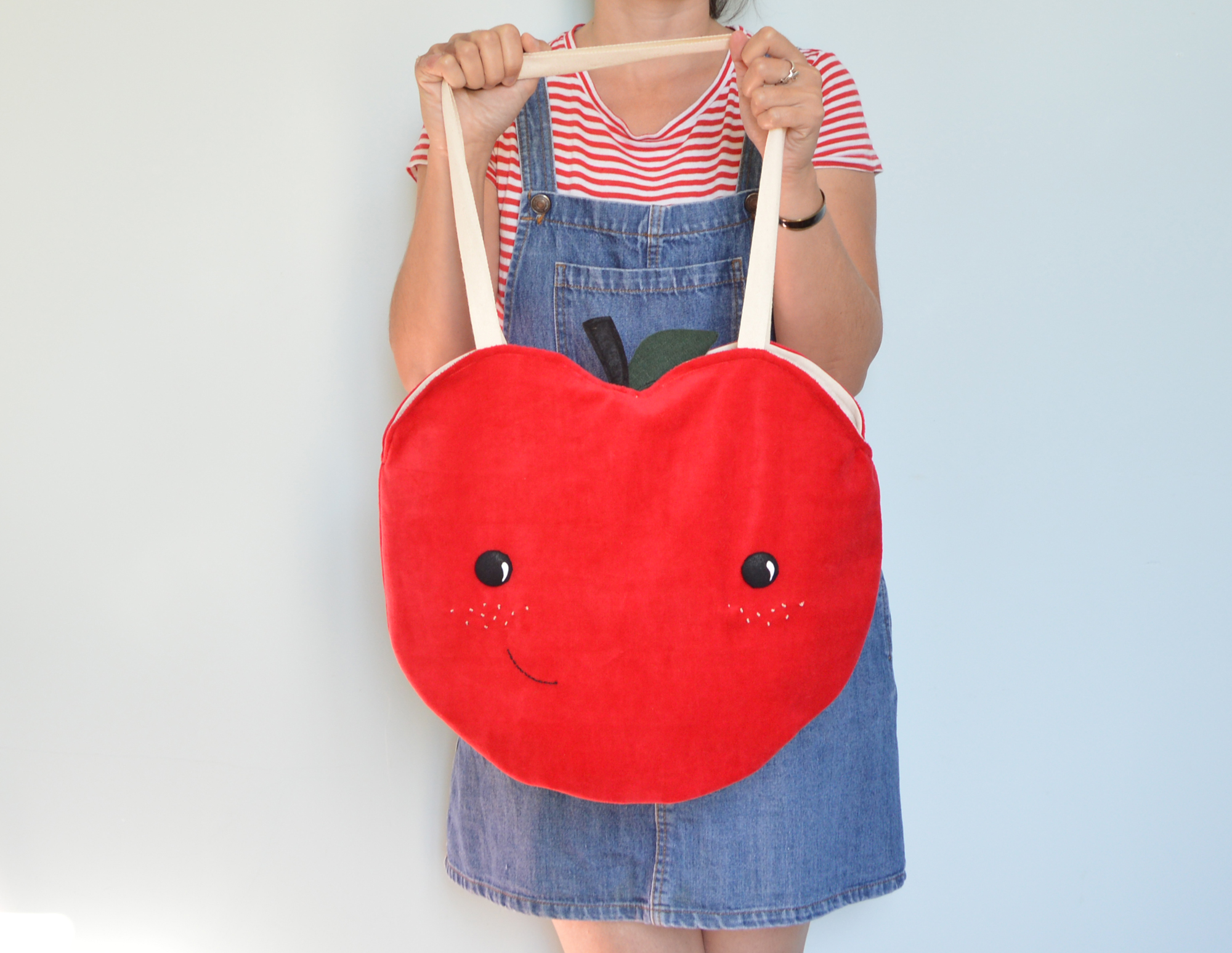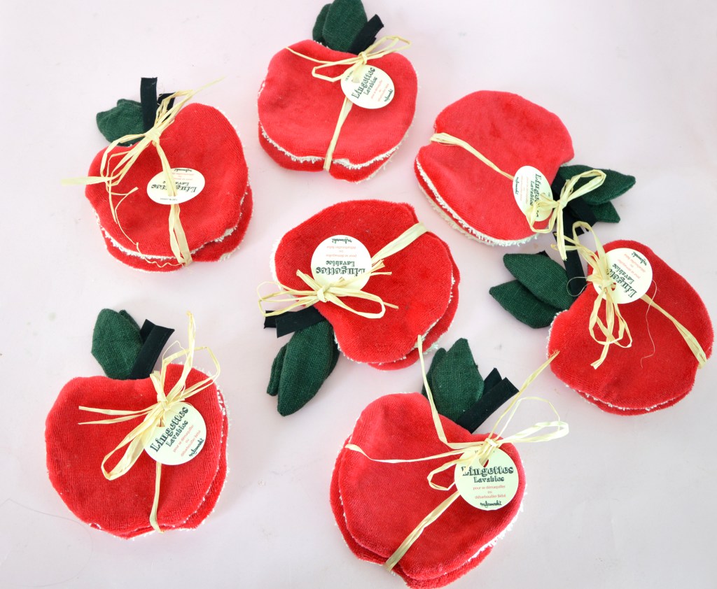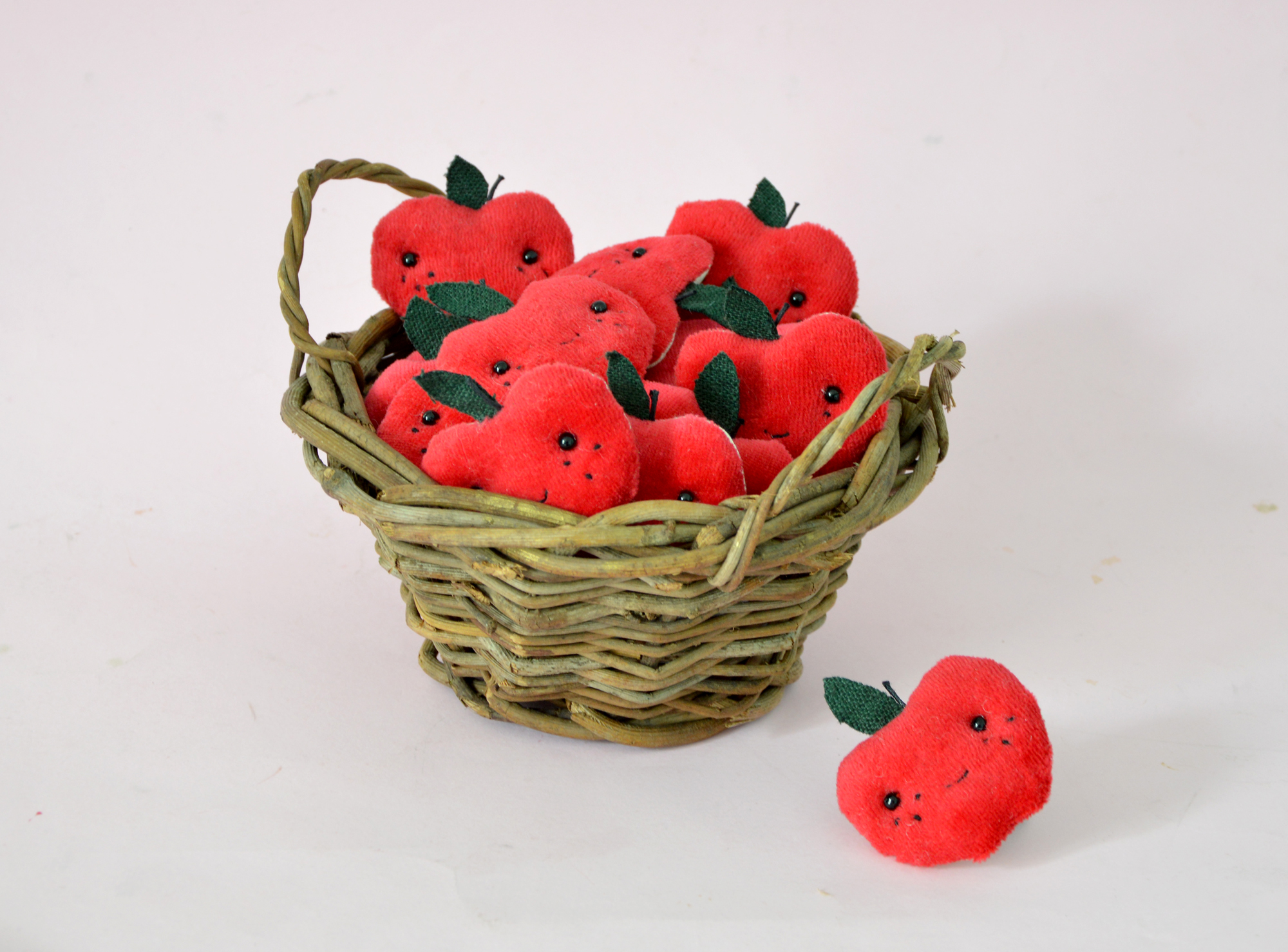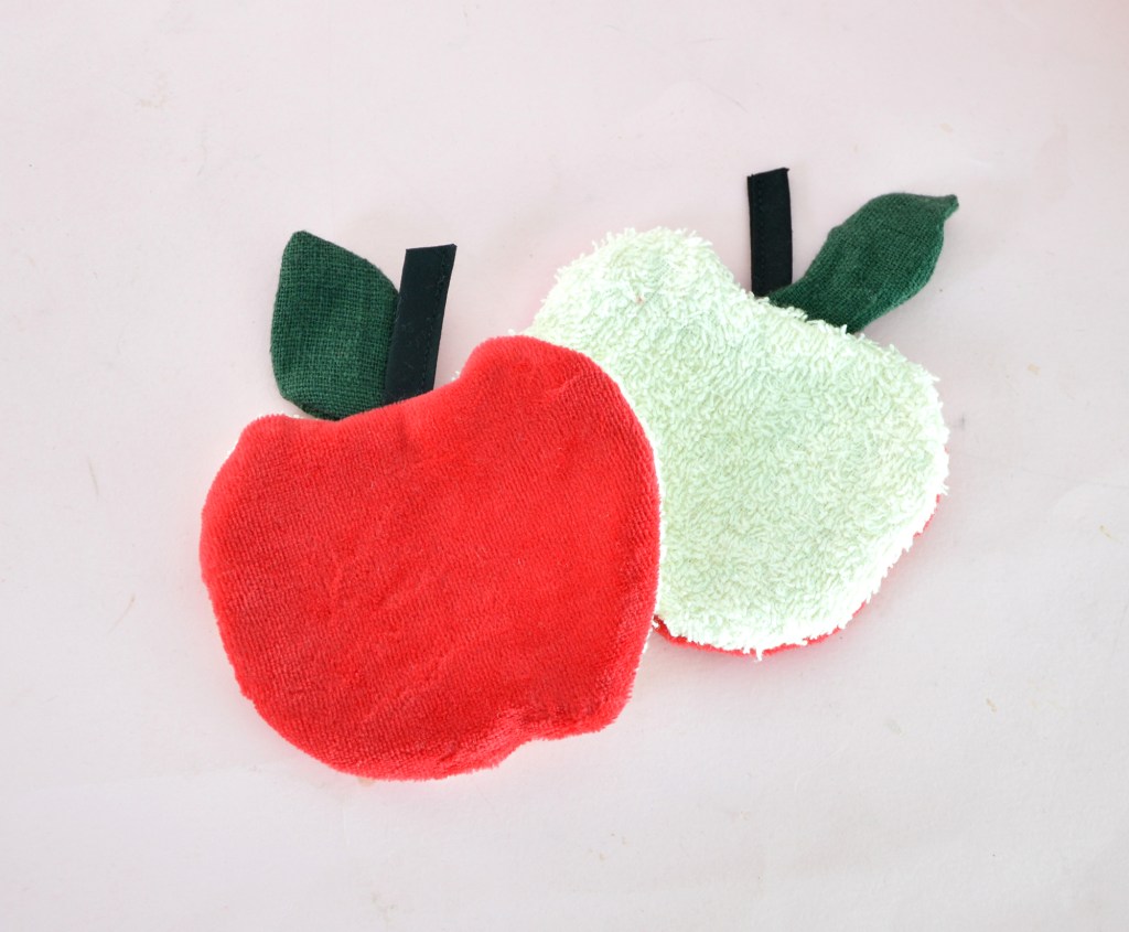 Chaque pomme est faite d’une face en velours Ă©ponge rouge et d’une face en Ă©ponge coloris champagne.