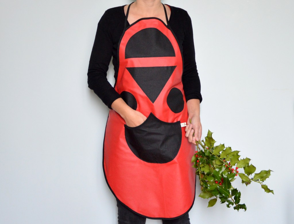 Coupé dans un joli coton enduit rouge (qui permet d’être vite nettoyé), je lui ai ensuite appliqué ses formes géométriques.