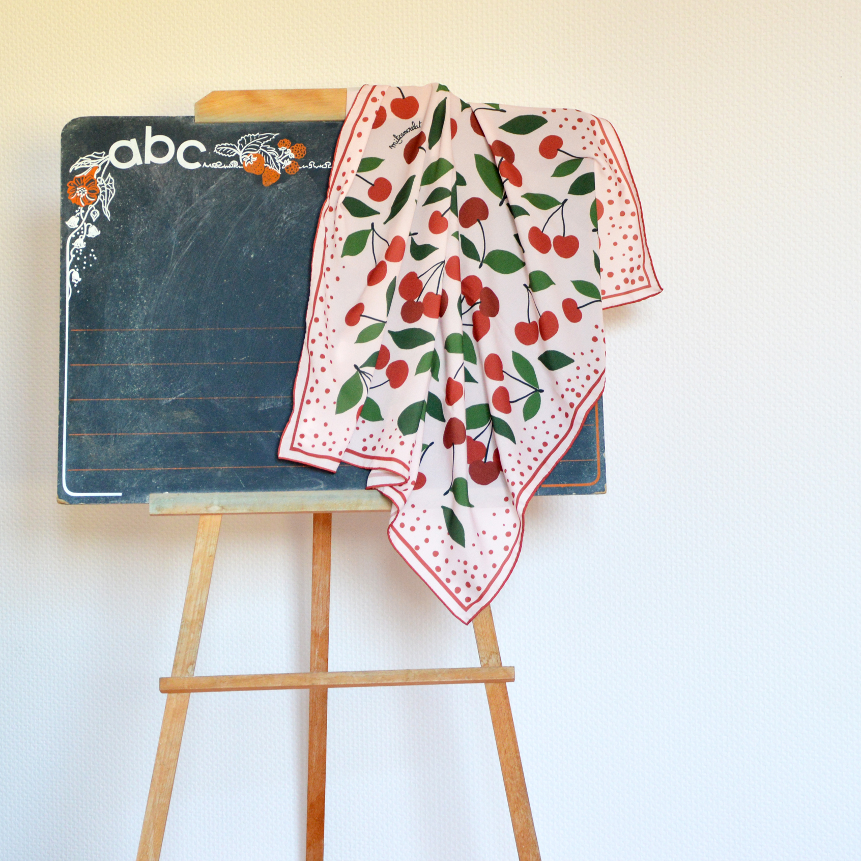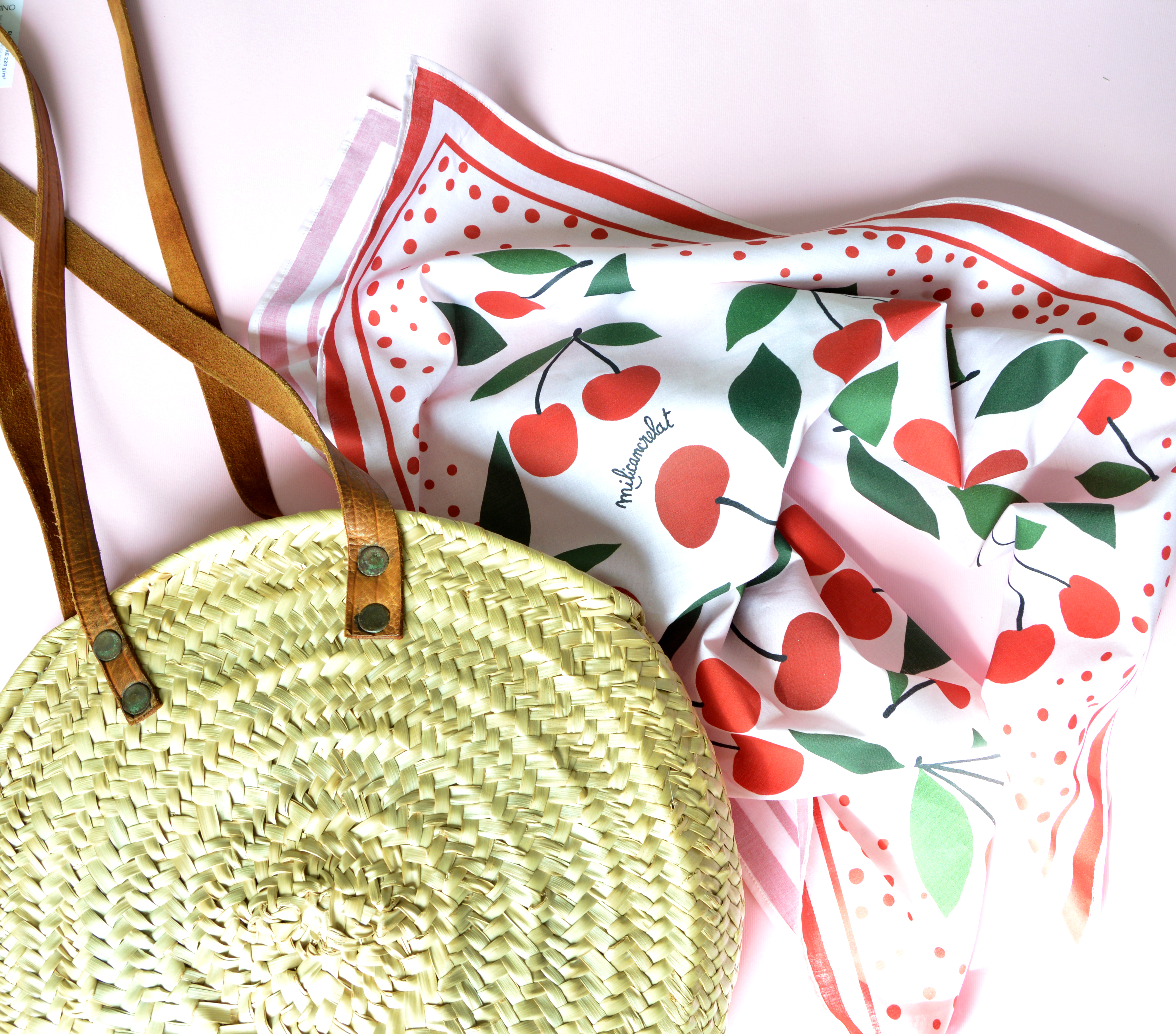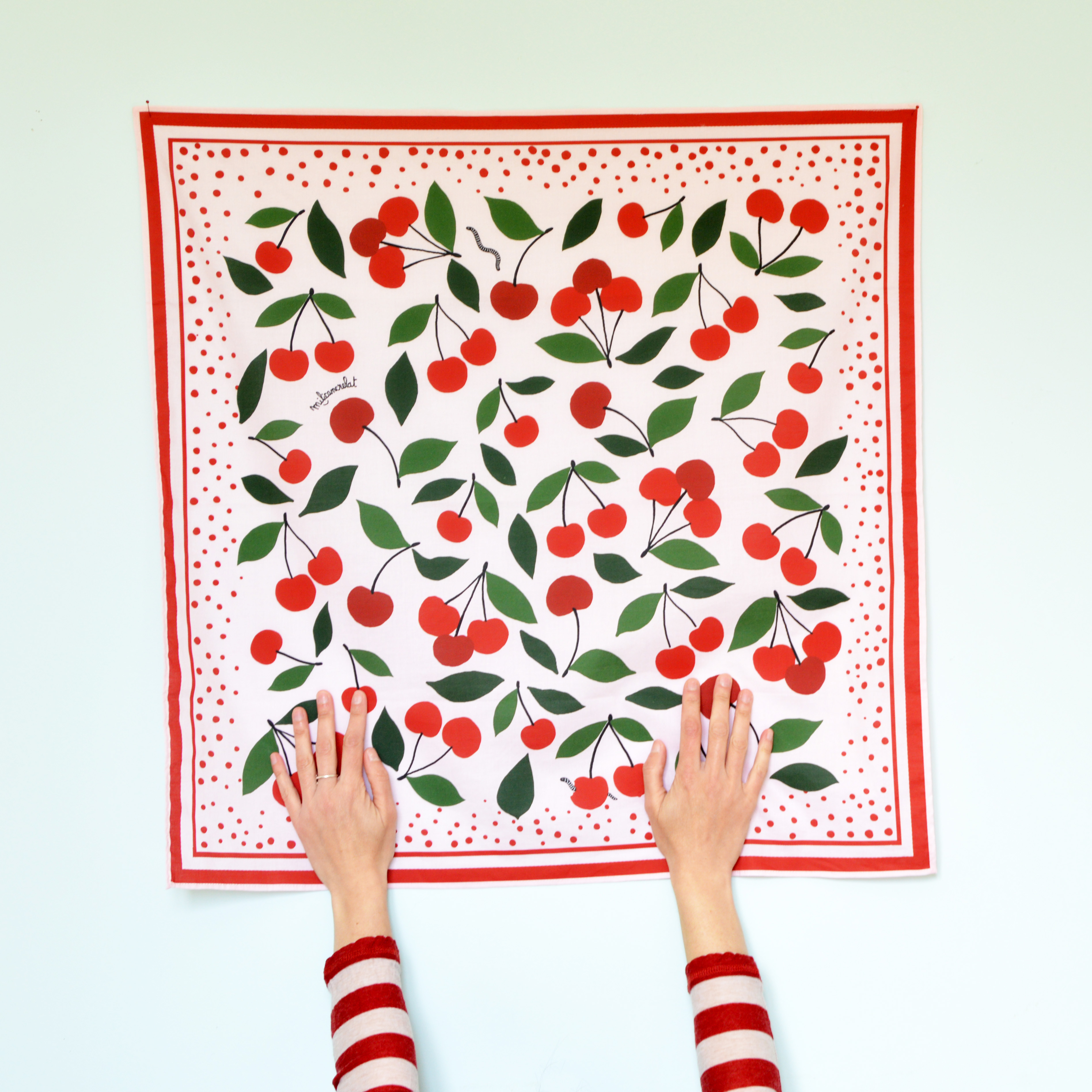 Le motif cerises et petit asticots est dessinĂ© par mes soins puis imprimĂ© en Europe avec des encres respectueuses de l’environnement sur une toile de coton lĂ©gĂšre.